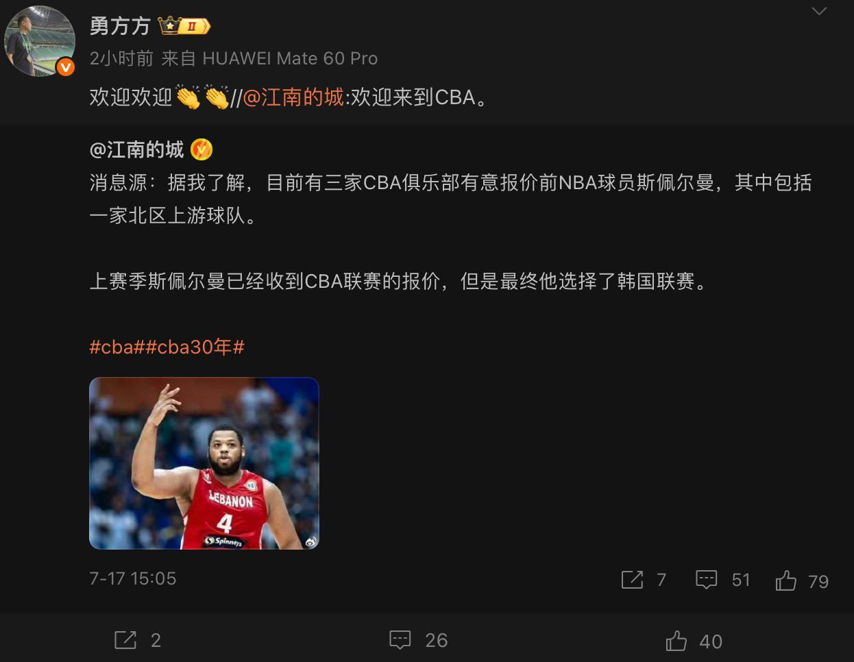篮球媒体人“勇方方”在社交媒体向斯佩尔曼表示了欢迎,而且有消息称这位外援下个赛季将代表北京首钢男篮出战。